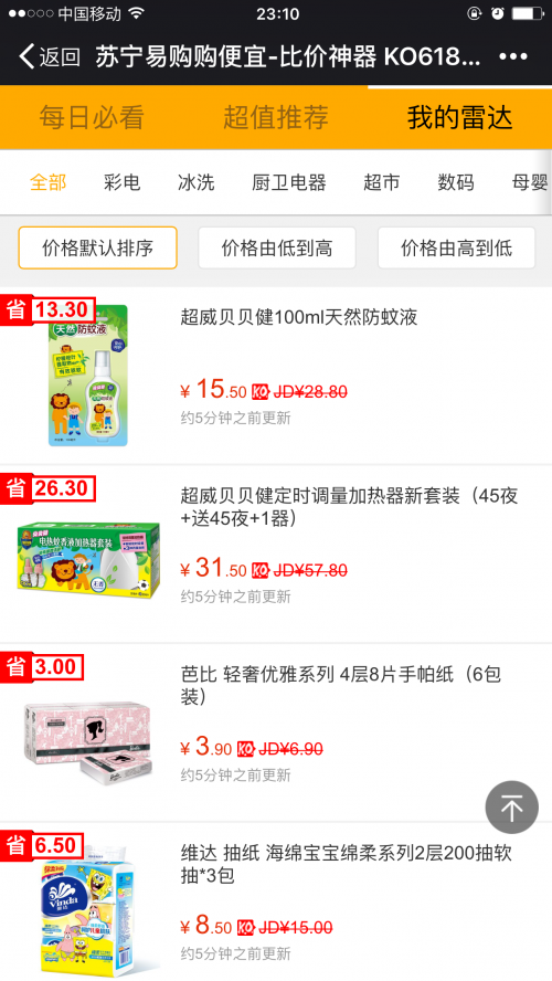 或许是国美在线放的大招刺激到了苏宁,6月14日,苏宁易购App上线“我的雷达”版块。每5分钟更新扫描一次,直接显示同种商品价格比京东便宜多少钱。