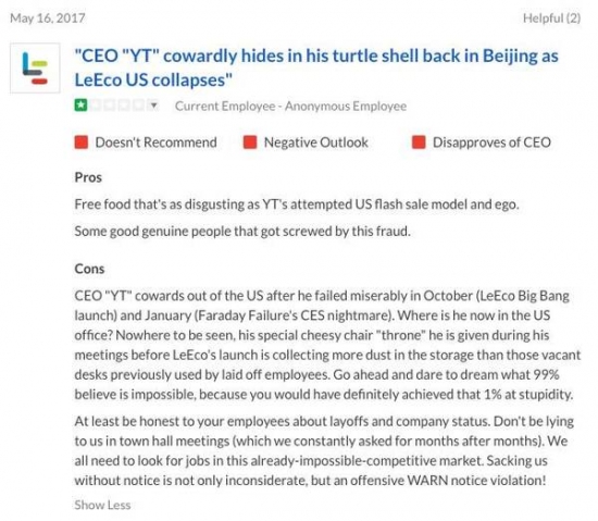 在一封名为《贾跃亭在北美全线溃败后,懦弱地回到北京躲在龟壳里》的评价里,一位员工在5月16日指出了公司在“不诚实”地裁退员工——不仅不能诚实公布公司当前的状况,甚至继续为员工画大饼忽悠。
