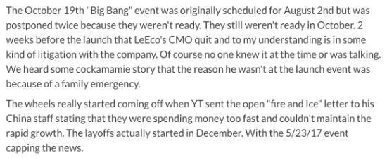 “乐视北美从包括Google、三星、HTC等等世界一流的企业雇佣到了很多很有才干的员工,但远在中国的管理层却完全拒绝倾听这些人的意见。中国总部认为他们才是最了解美国市场的人,但是乐视(在美国)正在经历的土崩瓦解却恰恰证明了他们的决定是错误的。更糟糕的是,他们竟然强迫我们发布一些没有完成研发完整,没有准备好,甚至仍然存在问题(bug)的产品。”