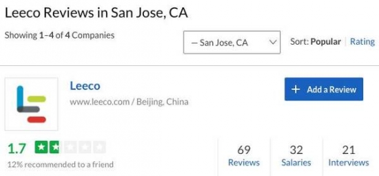 不过比起水军刷评论更尴尬的是,哪怕算上这些虚假的夸赞,在满分5分的情况下,乐视在Glassdoor上的评分竟然也只有少的可怜的1.7分。