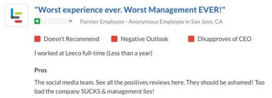 对于乐视的这个“水军技能666”的社交媒体团队,乐视美国的员工早已忍受不了,甚至在Glassdoor 上雇主的优点这一项下写下了“最佳社交媒体团队”进行讽刺。