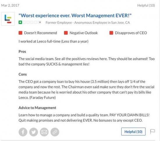 “我还在乐视,但是目前因为他们资金链问题,正在计划在下月裁撤150人。不过乐视唯一不想裁撤的就是社交媒体团队——他们需要一直,一直,一直在这里(Glassdoor)和其他一切可以给乐视评分的地方当水军,刷假评论。乐视一直在对媒体说谎,因为他们太害怕这会影响到法拉第未来的其他股东的决定。”