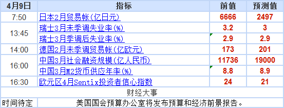 ★4月9日(周一):日本贸易帐、瑞士失业率、欧元(1.2282, 0.0043,0.35%)区投资者信心指数、贸易战、美国预算和经济前景报告