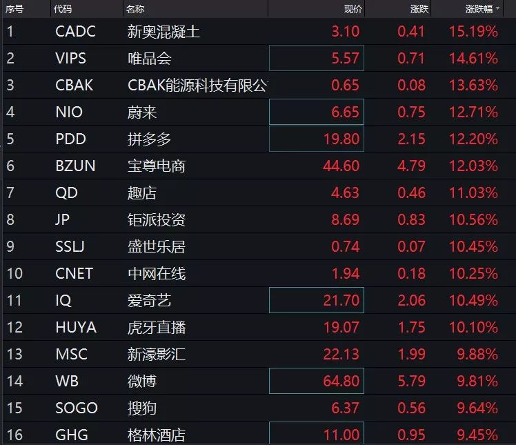中概股全线飙涨,唯品会、蔚来、拼多多、趣店、爱奇异等12只个股涨幅超过10%,微博、搜狗等涨幅超过9%,网易、拍拍贷、宜人贷、新东方、陌陌、京东、南方航空、聚美优品、新浪、前程无忧、携程网、阿里巴巴等70多股涨幅超过5%。