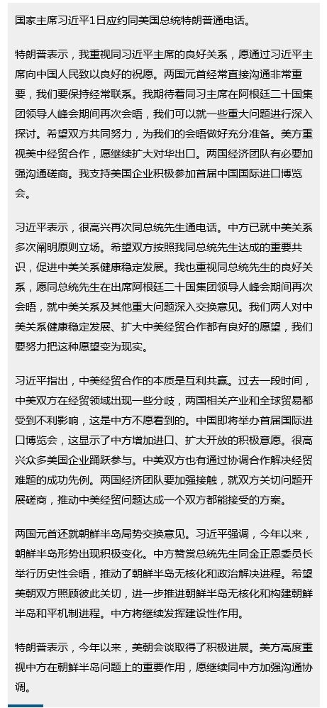 习近平表示,很高兴再次同总统先生通电话。中方已就中美关系多次阐明原则立场。希望双方按照我同总统先生达成的重要共识,促进中美关系健康稳定发展。我也重视同总统先生的良好关系,愿同总统先生在出席阿根廷二十国集团领导人峰会期间再次会晤,就中美关系及其他重大问题深入交换意见。我们两人对中美关系健康稳定发展、扩大中美经贸合作都有良好的愿望,我们要努力把这种愿望变为现实。