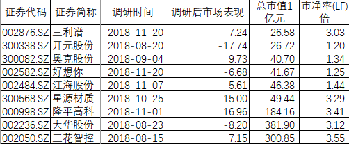 中庚基金的调研名单上的公司有两个特点。第一,市净率低。市净率最高的是三花智控(13.060, -0.14, -1.06%)为3.55倍,其中4家公司的市净率小于1.5倍。