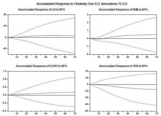 1图2(上部)比特币对美元和人民币存在正向的脉冲冲击关系,与图3(上部)美元对自身和人民币的冲击关系曲线形态一致。