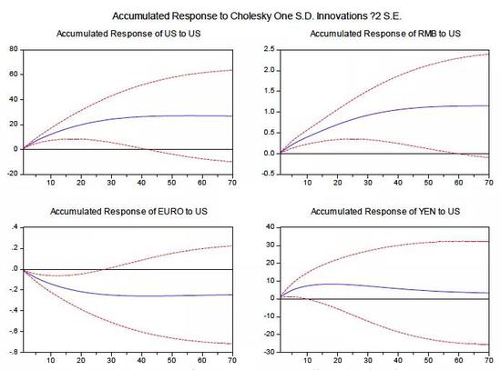 从美元对人民币方向看,存在单向显著的因果关系,说明美元是人民币汇率变动的原因,这与美元世界货币具有的霸权地位匹配。