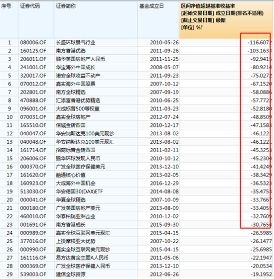 再看看成立以来跑输基准的QDII基金: