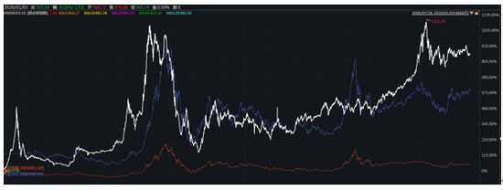 通过越南胡志明指数(白色)与沪深300指数(4129.295, -15.67,-0.38%)(4129.2954, -15.67, -0.38%)(蓝色)与沪指(橙色)对比发现:2000年-2014年期间,胡志明指数和沪深300指数走势相近似;但是2015年A股大牛市,越南没有;2017年下半年后,胡志明指数暴涨,沪深300指数低迷,二者分化较大。