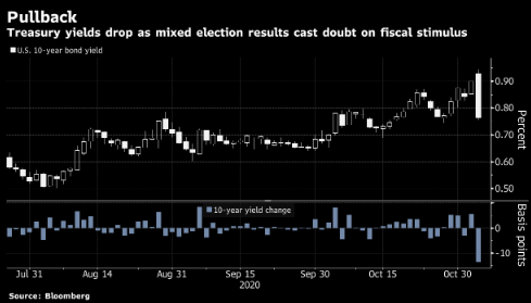 美国大选结果尚未出炉,但没有一党大获全胜的可能性打击了新一轮刺激措施出台的希望,颠覆了看空美国国债的主流观点。就连美国周三公布创纪录的季度发债计划,也未能遏制美债数月来单日最大幅度的上涨,发债重心略微偏向短端,帮助收益率曲线趋平。