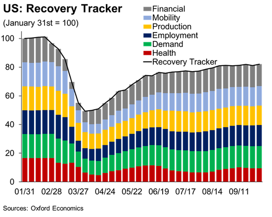 牛津经济综合复苏指数连续第三周出现下跌,并创下了8月中旬以来的最低水平。牛津大学首席美国经济学家Gregory Daco表示:“新冠病毒感染激增和财政支持下降导致美国经济复苏明显放缓。经济正在向决策者发出令人沮丧的信号。”